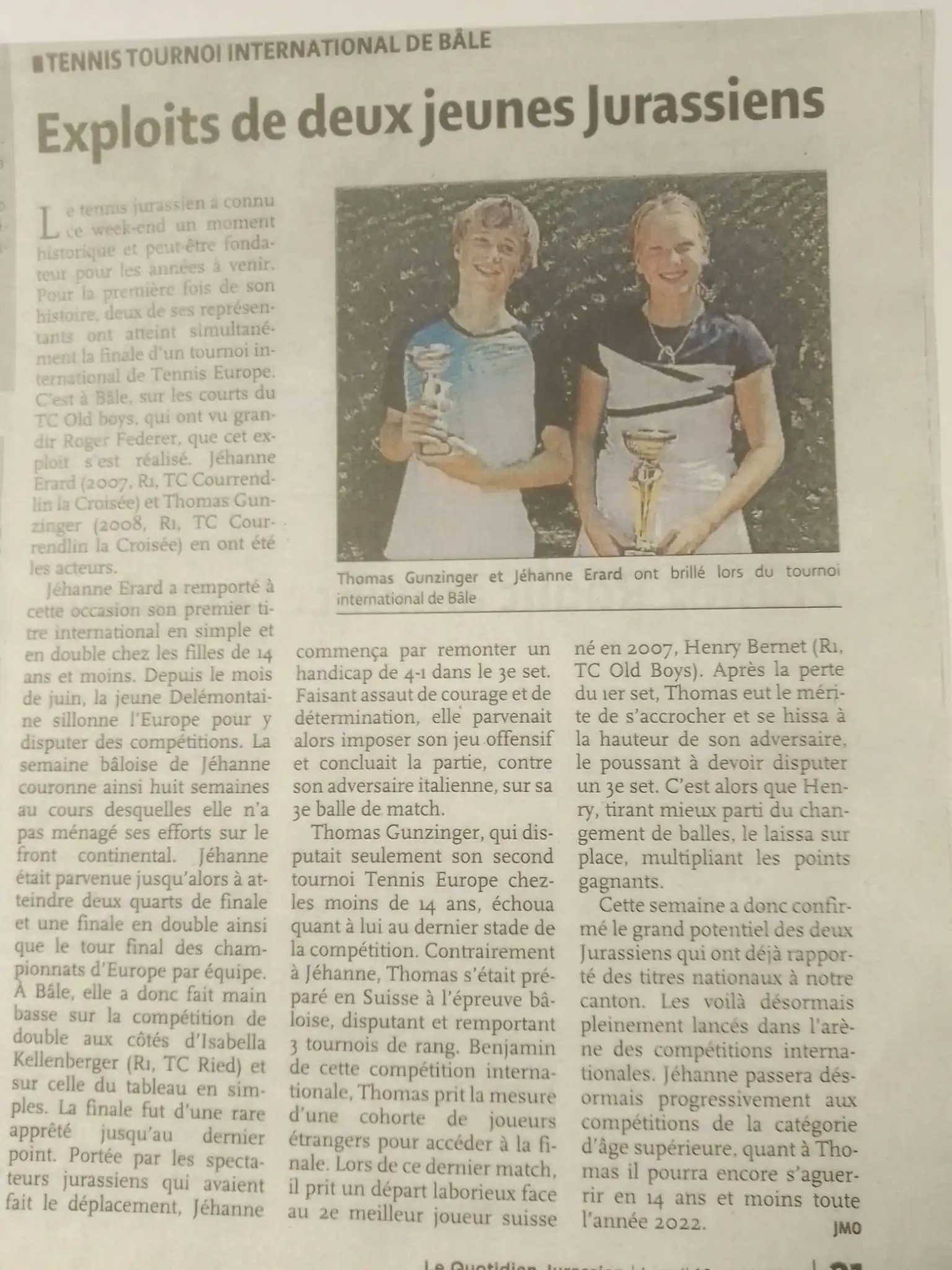 Exploits de Jéhanne et Thomas au tournoi international de Bâle