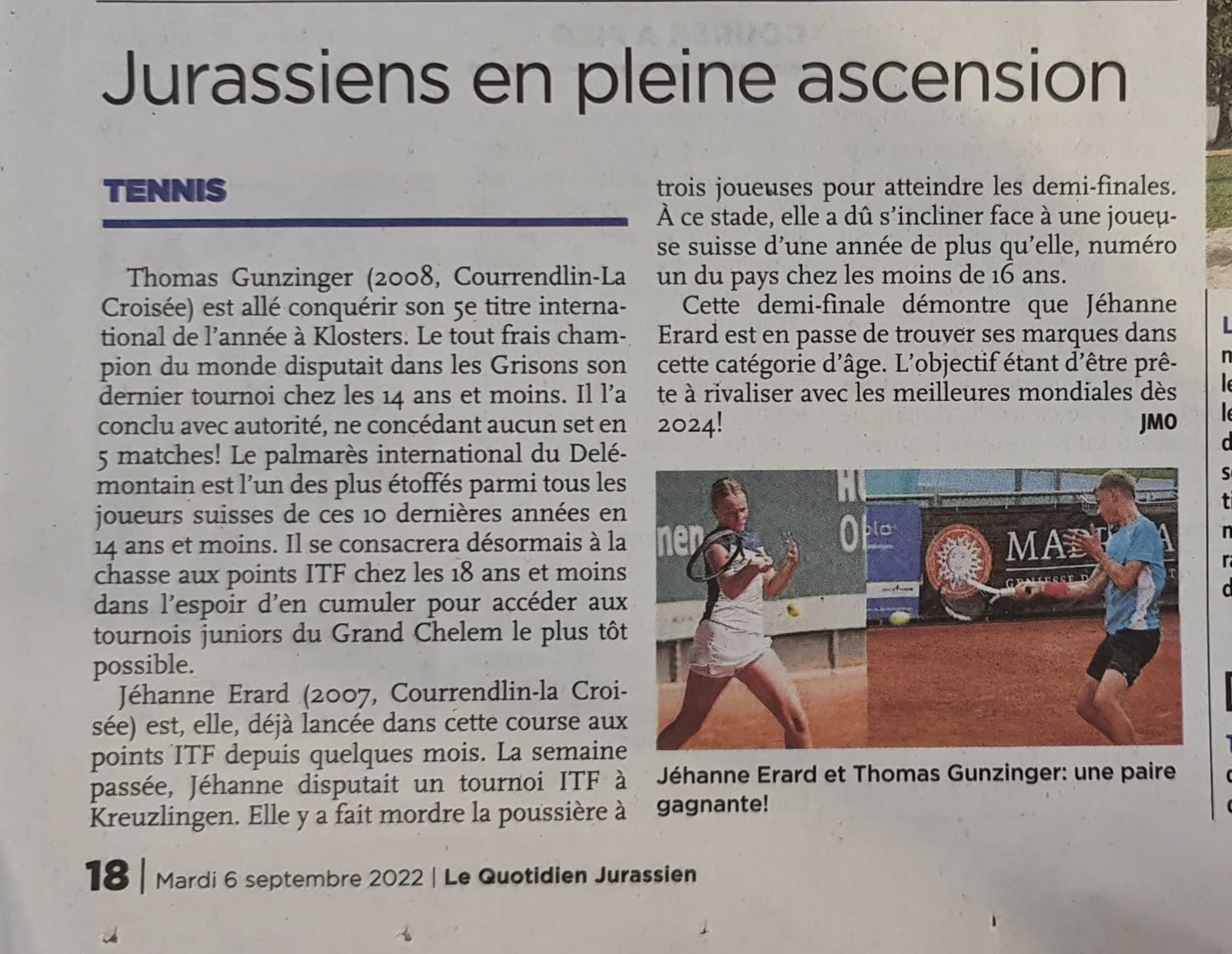 Au niveau national ou International, le tennis jurassien est présenté par deux de nos jeunes, qui sont actuellement les meilleurs de leurs catégories au niveau national.